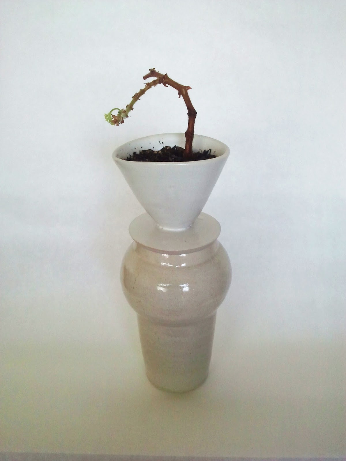 One cutting, the heartiest of the bunch, seemed to be doing just fine. Although I still didn't find any trace of roots, I decided to plant it in soil anyway. The only cup I had that provided any drainage was a coffee strainer I made in porcelain. It's too small to effectively support a paper filter so I'm glad that it serves a purpose as a geranium pot. I placed the strainer on a vase, to lift it up a bit and to collect any drained water.